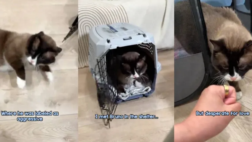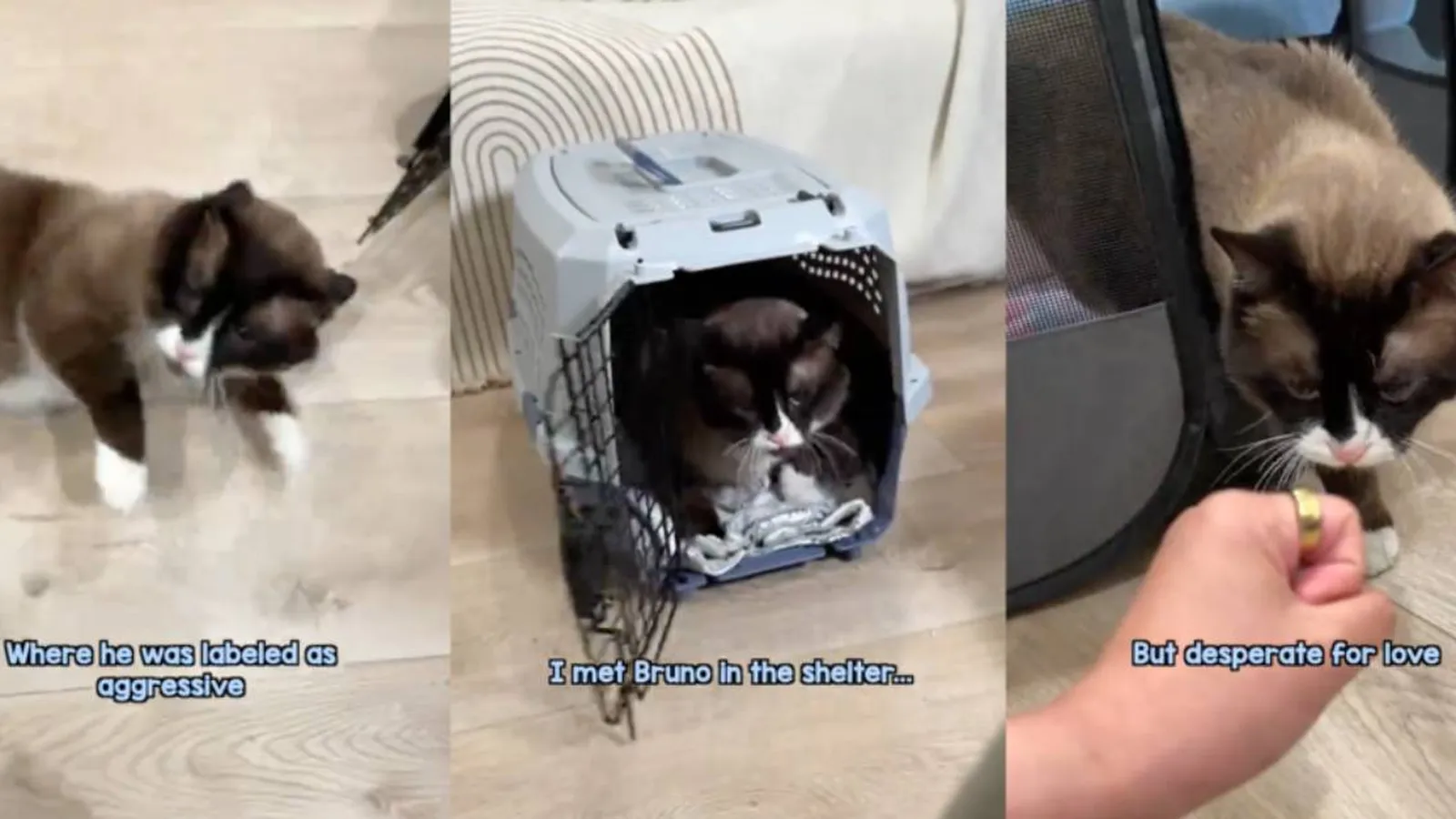 Bruno es un gato de la raza siamés que al ser rescatado y acogido, mostró signos de agresividad. El miedo, la desconfianza y la timidez se apoderaron de él. No quería salir del transportín, además de responder con mordiscos y arañazos a los intentos infructuosos de acercamiento por parte de la dueña. La publicación ha sido compartida en la cuenta de TikTok de la usuaria @kittyboyandfriends: