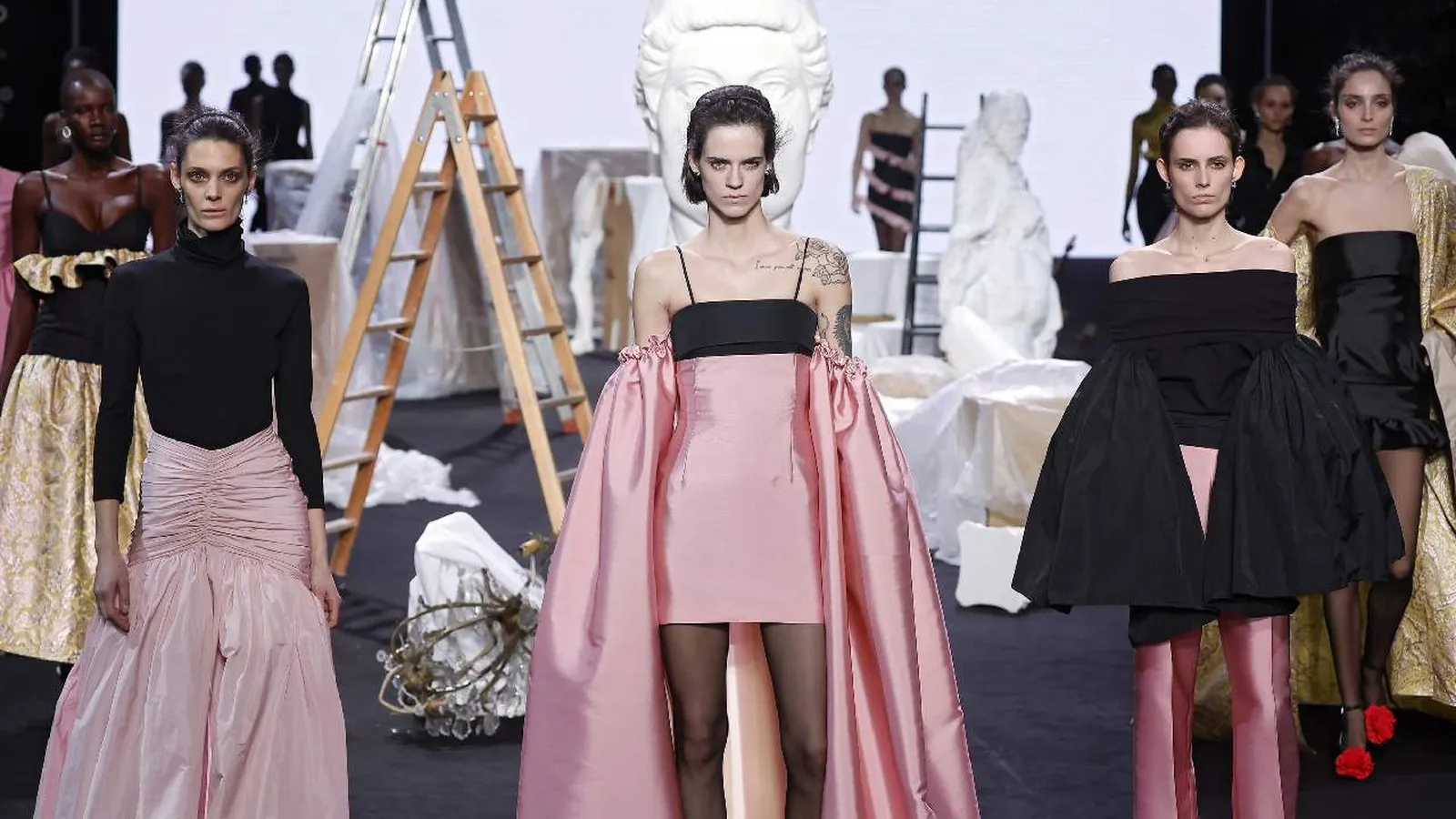 El prenda en cuestión, una vestido con un efecto globo que aportaba volumen y dinamismo, presentaba una parte superior en color negro con un finísimo tirante. El resto de la prenda se teñía de un suave tono rosa en uno de los casos y en rosa fucsia en el otro, creando un contraste elegante y sofisticado. Esta combinación de colores y formas resaltaba la habilidad de Encinar para fusionar elementos clásicos con toques modernos, ofreciendo una pieza versátil apta para distintas interpretaciones.