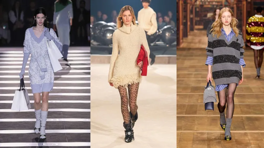 Durante los meses más fríos, llevar el vestido tipo jersey con medias gruesas o leggins puede ser una opción cómoda y estilosa. Para las más atrevidas, las propuestas de Escorpion, con sandalias y calcetines, Isabel Marant con medias de animal print y Elisabetta Franchi con medias de cristal y calcetines.