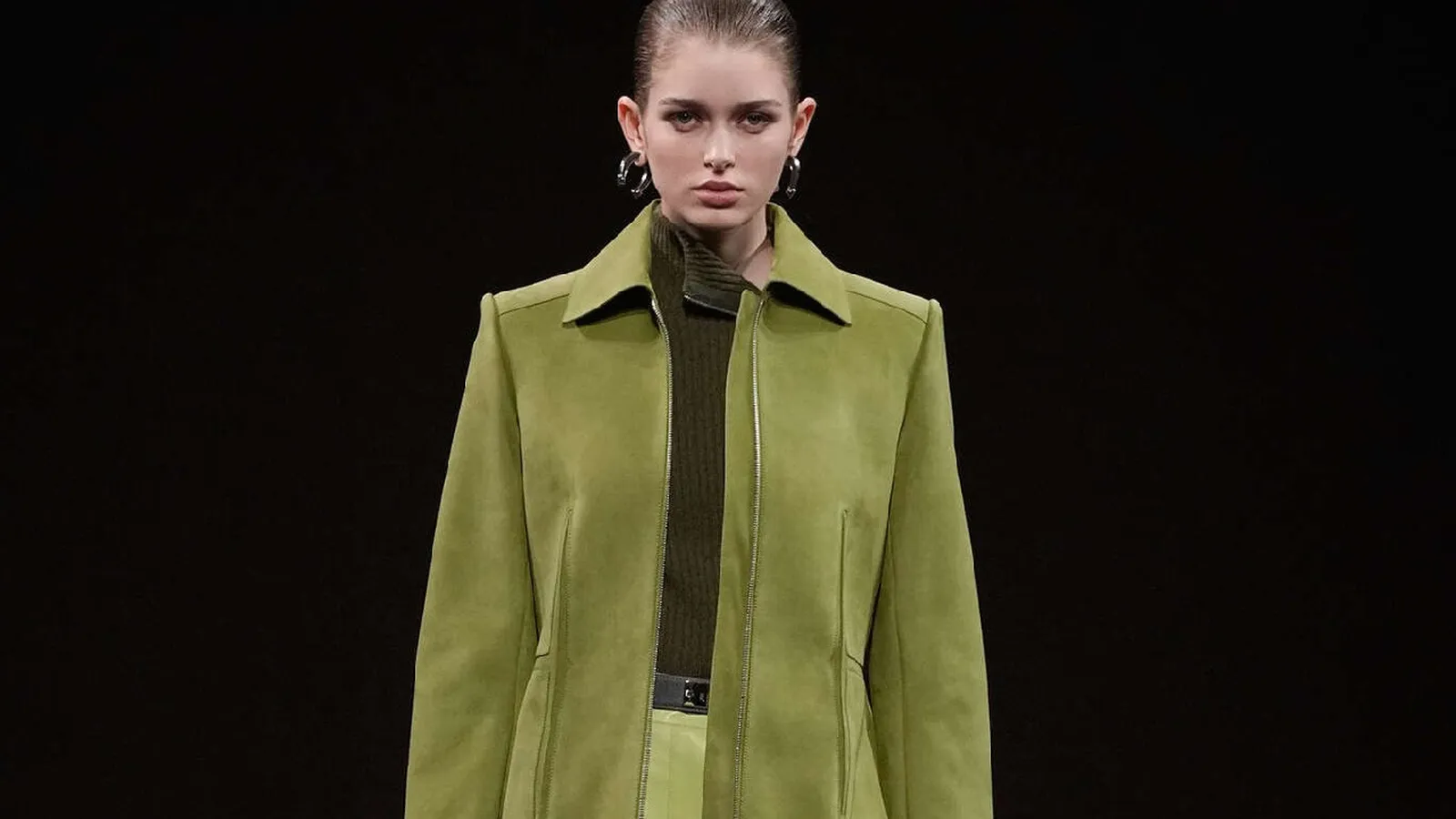 Los accesorios juegan un papel fundamental. Botas y botines con punta en negro, gris, burdeos y verde aceituna complementan los conjuntos, aportando un toque de carácter. Los bolsos y cinturones de piel, característicos de Hermès, se integran de manera orgánica, realzando la estética general sin restar protagonismo a las prendas principales. Las medias tupidas, lisas y a juego con los estampados de las faldas y vestidos, añaden coherencia y continuidad al estilismo.