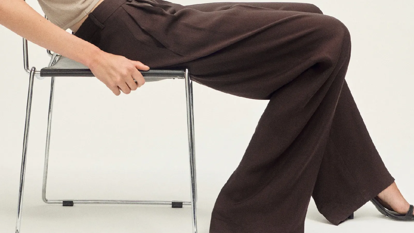 El pantalón de pinzas wideleg en mezcla de lyocell lo convierte en una opción muy fluida que no se ciñe al cuerpo, ideal para siluetas curvilíneas o para quienes buscan comodidad sin renunciar al estilo. El tono marrón chocolate es neutro pero sofisticado, y el tiro medio, junto con el detalle de pinzas, favorece visualmente el vientre y alarga las piernas.