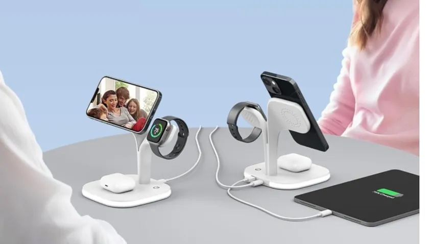 Este cargador inalámbrico no solo simplifica tu espacio, sino que también ofrece eficiencia y rapidez en la carga. También cuenta con soporte magnético de carga para asegurar que los dispositivos permanezcan estables mientras se cargan, evitando caídas accidentales.