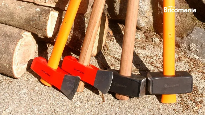 La maza-hacha dispone de una cara plana para el golpe y una parte cortante para astillar piezas de madera. Los pesos más habituales son 2,5 y 3,5 kilos, y se utiliza para astillar troncos.