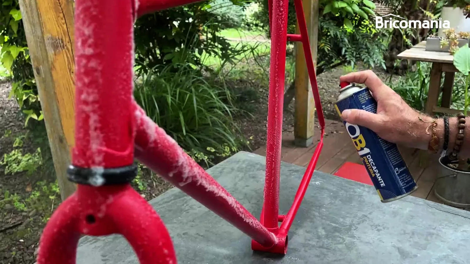 En este caso, vamos a quitar la pintura de unabicicleta metálica para cambiarle el color. Para decapar la bicicleta, bastará con aplicar el decapante de OB1, esperar 5 minutos y retirar la capa de pintura con un cepillo de nailon.