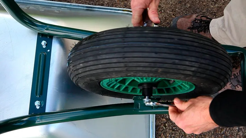 Para eso, damos la vuelta a la carretilla y soltamos las tuercas de fijación del eje de la rueda, ayudándonos de una llave fija y una llave inglesa.