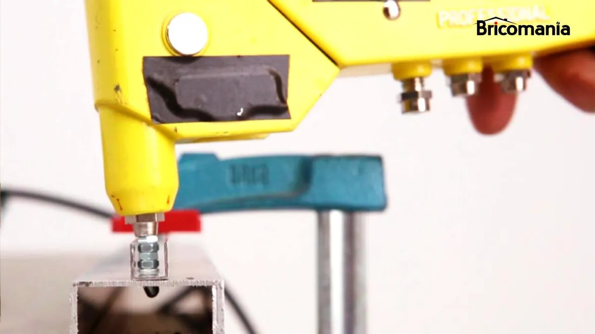 Para solucionar este problema, un truco eficaz es insertar un par de tuercas que actúen como calzos entre la remachadora y el perfil. Esto permitirá que la remachadora tenga un punto de apoyo sólido.