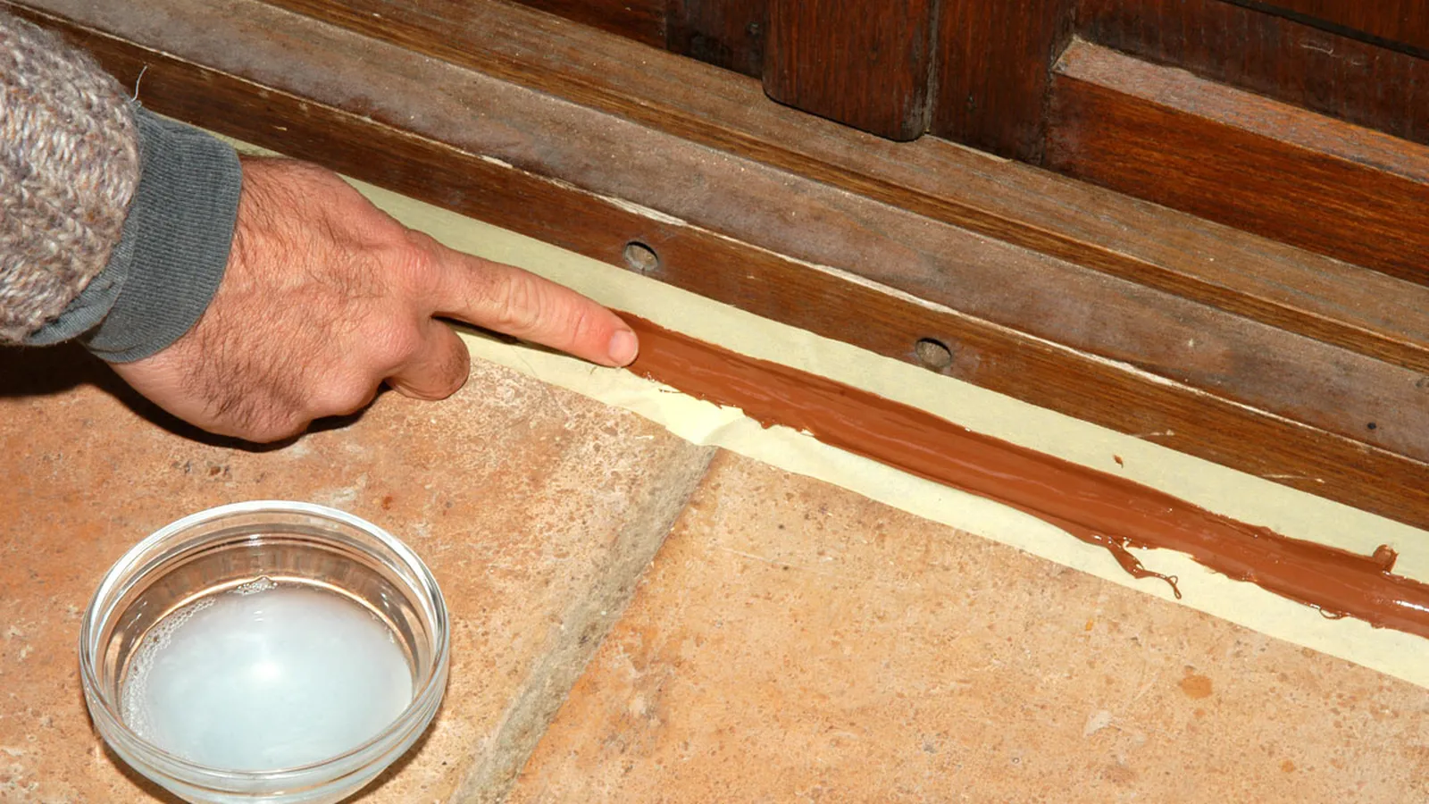 En nuestro caso, la humedad se filtra por la unión que hay entre el suelo y la puerta. Limpiamos la zona en profundidad con una rasqueta.
