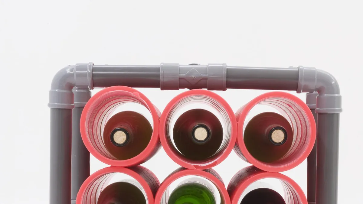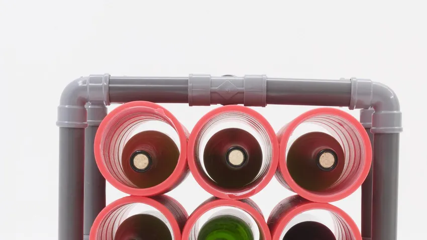 Para hacer este botellero, utilizaremos unos tubos y codos de PVC para conducciones de agua y otros corrugados, de los que se utilizan para conducciones eléctricas a la intemperie. Para la estructura del botellero utilizaremos unos tubos de PVC y unas piezas de unión del mismo material. Después, pondremos unos tubos corrugados en el interior de la estructura, en los que alojaremos algunas botellas y por último, colocaremos unas ruedas en la base, para poder mover fácilmente el botellero de un sitio a otro.