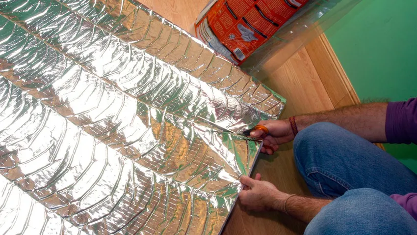 Para trabajar con mayor comodidad, extendemos el material aislante en el suelo y cortamos varias tiras con unas tijeras, aprovechando al máximo el material.