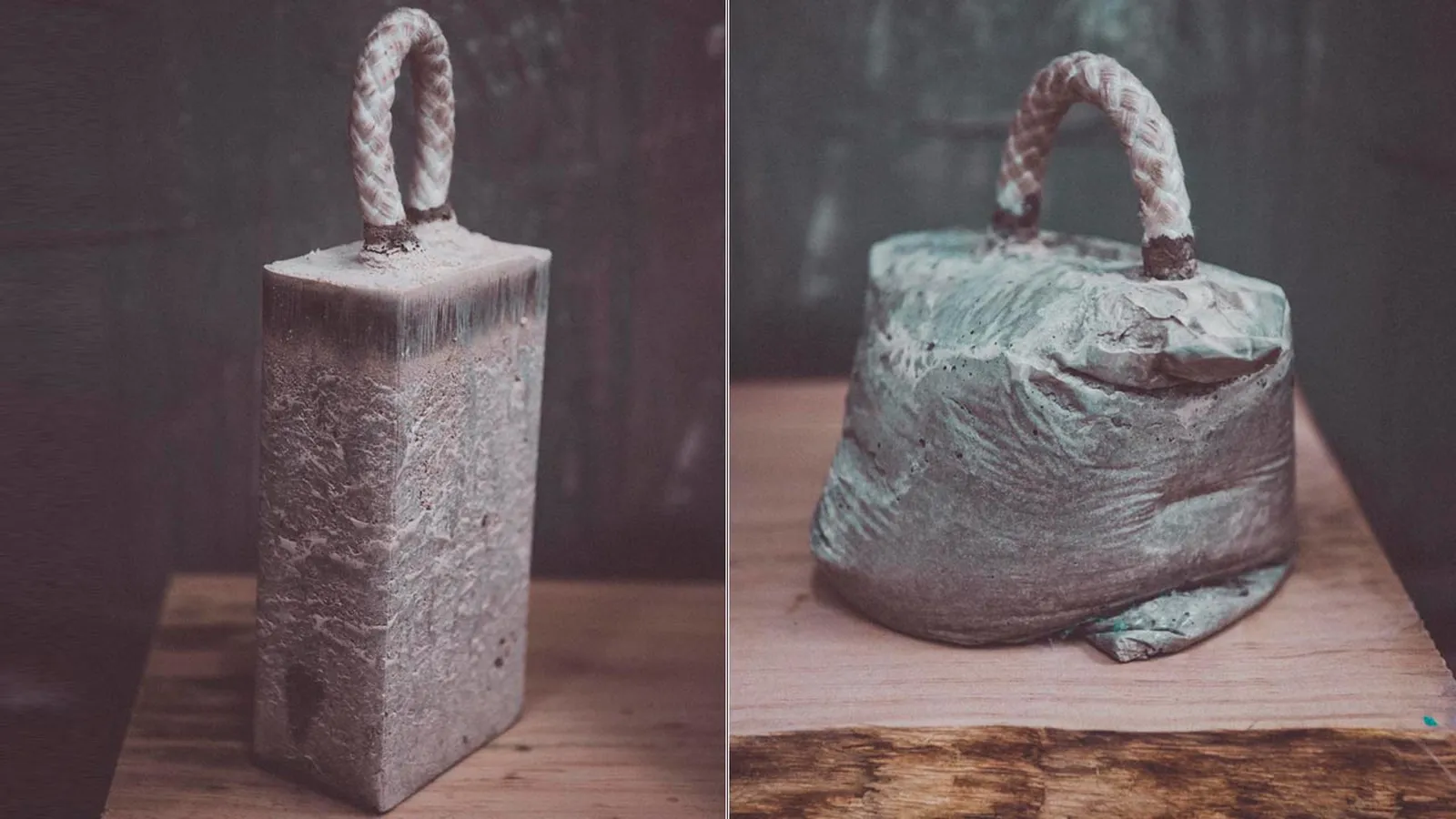Unos topes de puerta de hormigón, con una cuerda a modo de asa, a los que podremos dar formas diferentes en función del envase que utilicemos como molde.
