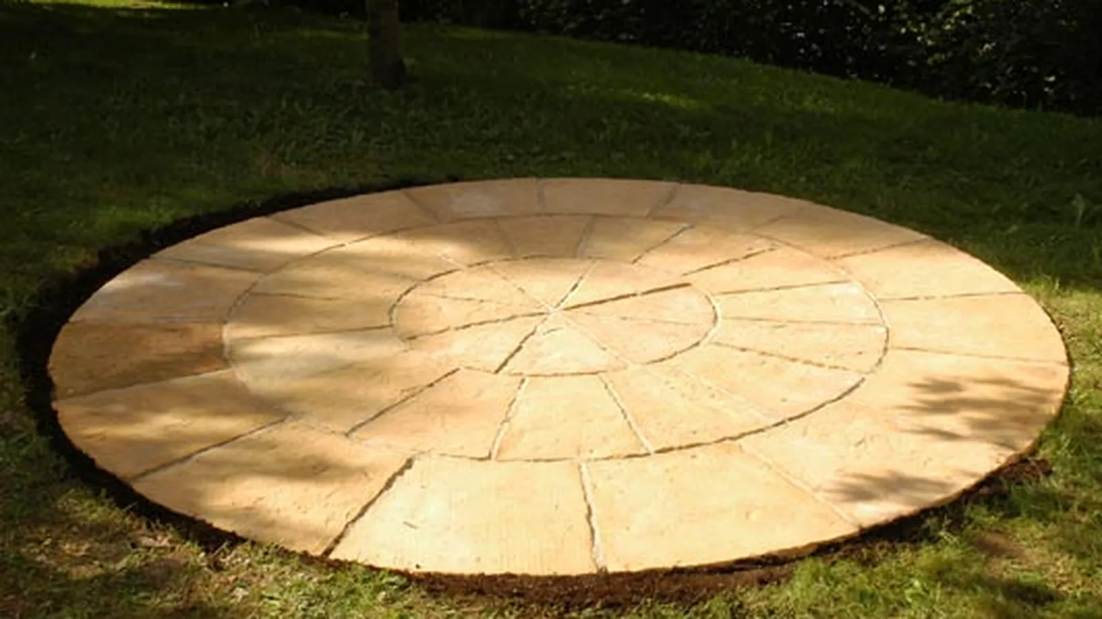 Vamos a colocar unas losas decorativas de jardín sobre una superficie lisa, concretamente una base de hormigón, con forma circular, que ya tenemos hecha.