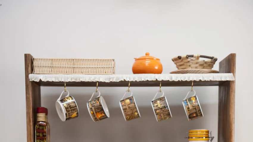 Finalmente, incorporaremos unos ganchos en la parte inferior de una de las baldas que nos servirán para colgar las tazas.