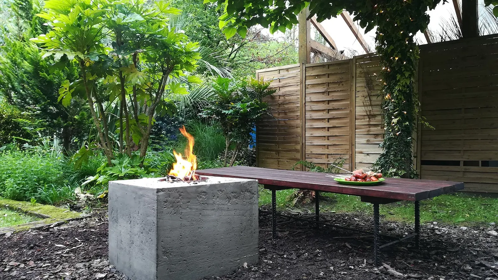 Colocamos un poco de leña. Le damos fuego y ya podemos disfrutar de una agradable velada en nuestro jardín.