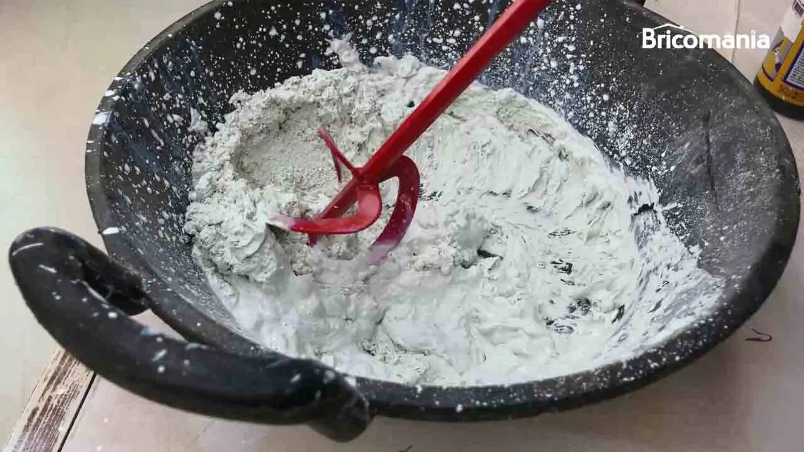 Mientras se seca la imprimación, vamos a hacer el microcemento. Mezclamos tres partes de microcemento con una de reactivo hasta que quede una masa homogénea.