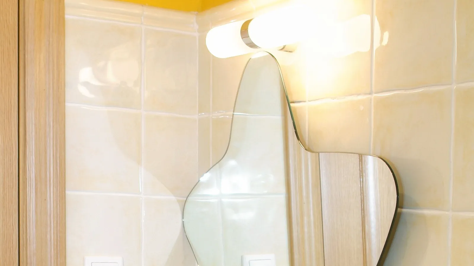 Para completar la decoración de nuestro cuarto de baño, vamos a colocar entre el lavabo y el aplique de luz, un espejo con forma irregular gracias a unos soportes.