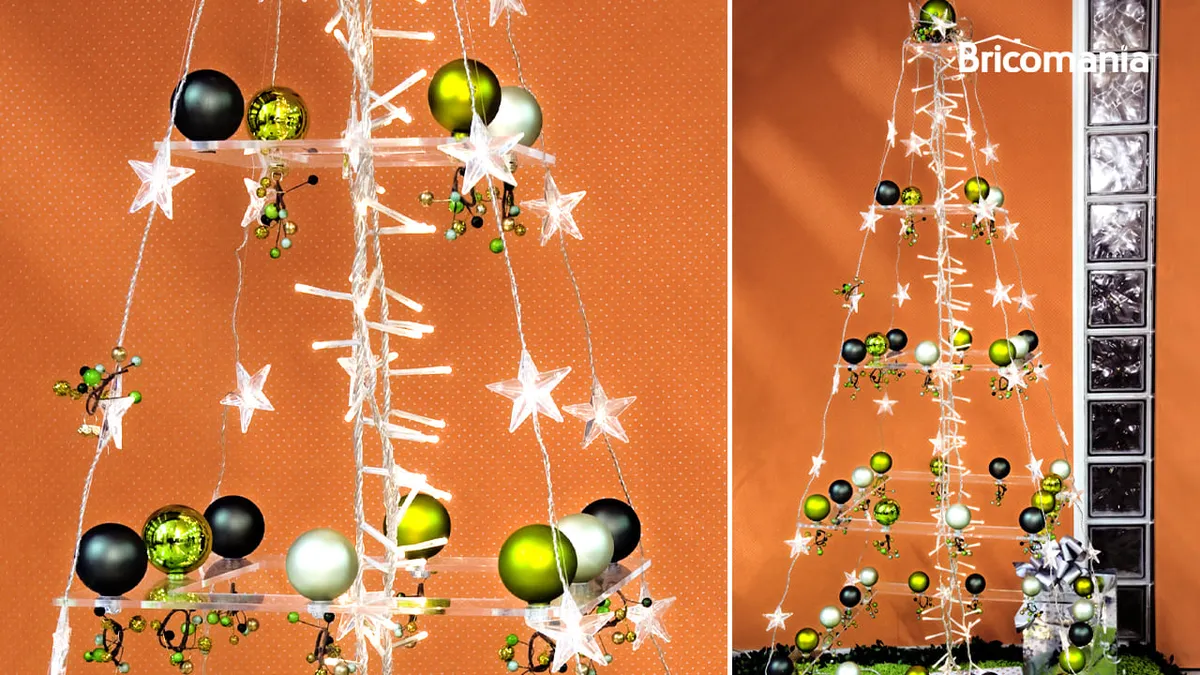 Con unas piezas de metacrilato, hilo de pita para suspenderlas del techo y unas bolas colocadas en posición invertida, haremos este árbol de Navidad que brillará con luz propia.