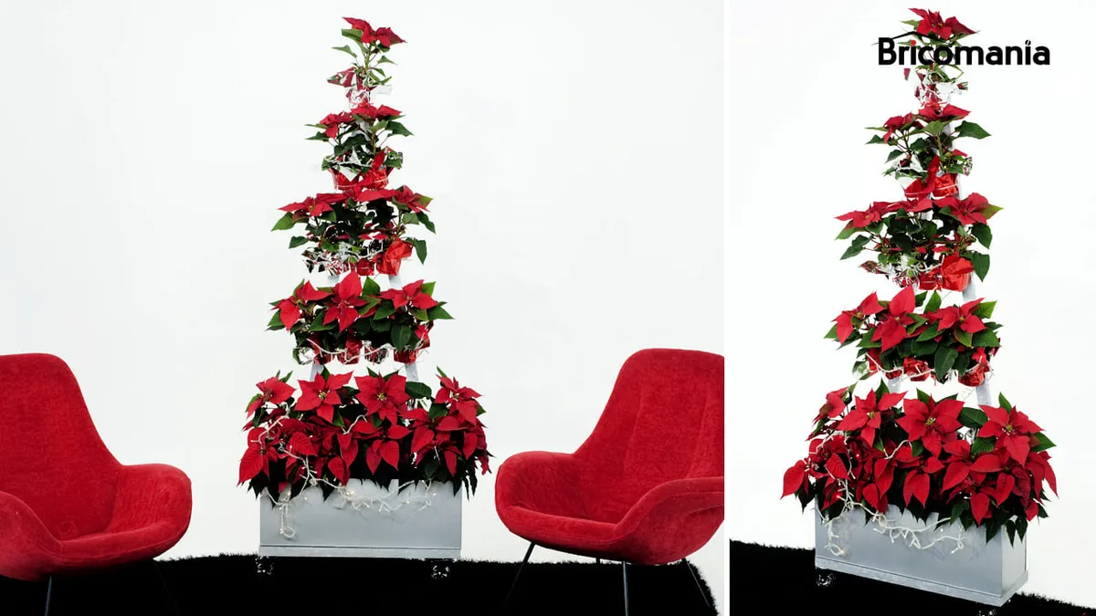 Un árbol de Navidad con flores de pascua es la alternativa que proponemos desde Bricomanía al abeto tradicional: una estructura de madera, con forma de pirámide, a la que añadiremos una jardinera y unas escarpias, para poder colgar y plantar un montón de poinsettias o Flor de Pascua, por ejemplo.
