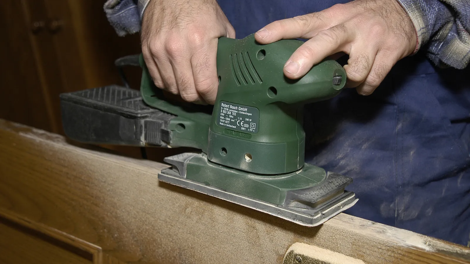 Nosotros vamos a usar una lijadora eléctrica. Sujetamos bien la puerta y pasamos la lijadora siguiendo la veta de la madera, hasta rebajar los milímetros necesarios.