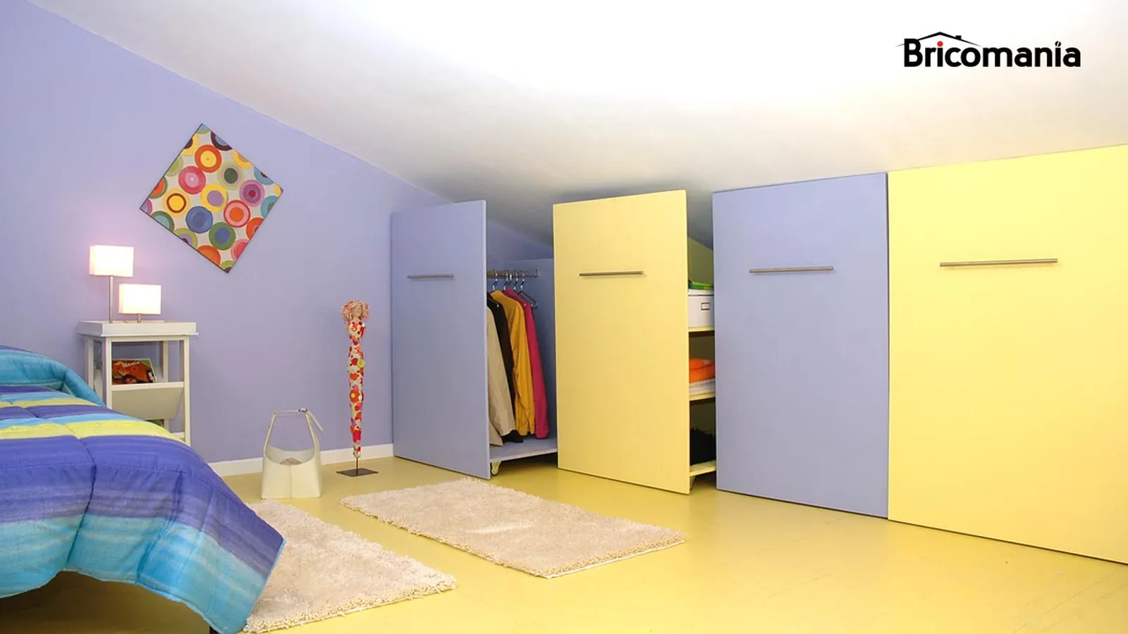Gracias a estos armarios móviles bajo techo, ganamos un espacio perdido y decoramos la estancia con un toque muy personal.