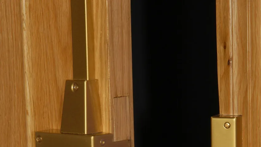 Tenemos tres piezas que corresponden a los puntos de anclaje o cierre: uno irá en el marco con lo que tendremos que hacer un rebaje en la jamba; el soporte de la cerradura central, para el que también haremos un rebaje en la jamba, y la tercera pieza que colocaremos en el suelo. Desmontaremos las jambas y haremos los rebajes con la sierra de calar y una hoja para madera. Después, las volveremos a colocar en su posición.