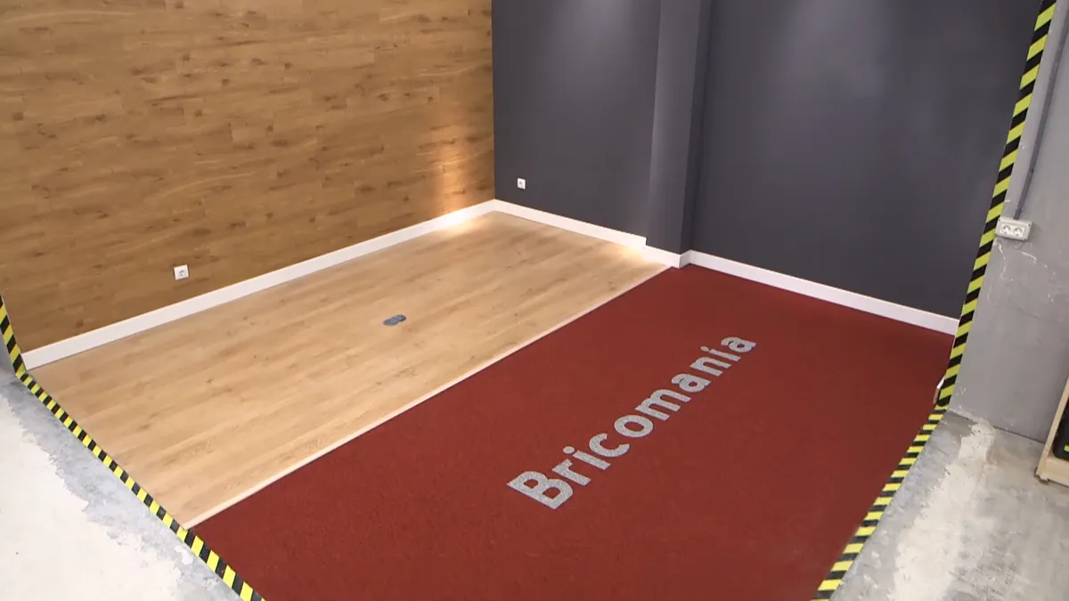 Esta vez, continuaremos tapando la otra mitad del suelo, con una elegante moqueta a la que incrustaremos el logo de Bricomanía. De esta manera, dividiremos la estancia en dos ambientes diferentes.