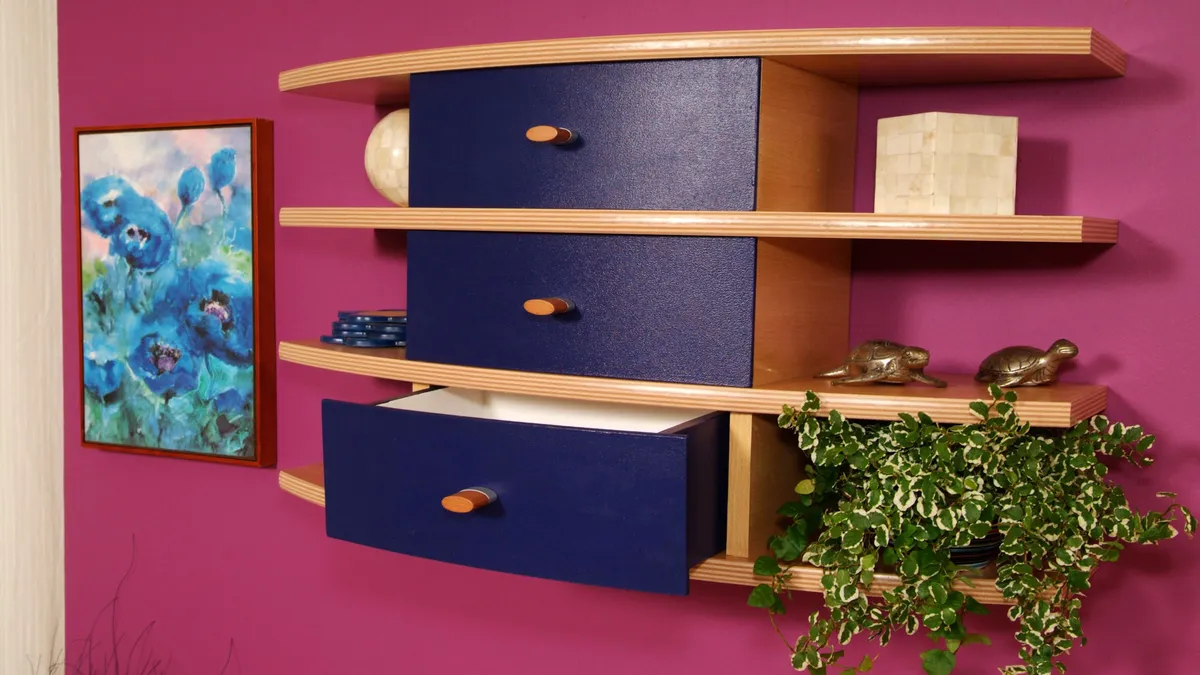 Con un poco de imaginación y unas baldas prefabricadas que podemos encontrar en nuestro centro habitual de bricolaje, construiremos una mueble con cajones curvados. Se trata de una consola o estantería muy original, de aspecto ligero y línea moderna, con unos cajones curvados que también realizaremos nosotros. Además, os enseñaremos una técnica muy sencilla para curvar la madera, una técnica que nos permitirá obtener un perfecto resultado.