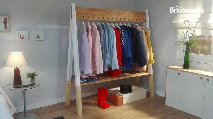 Estas se unirán con un gran travesaño del que colgarán las perchas. Además, tendrás que añadir una balda en la parte inferior, ideal para colocar cajas, calzado u otros accesorios.
