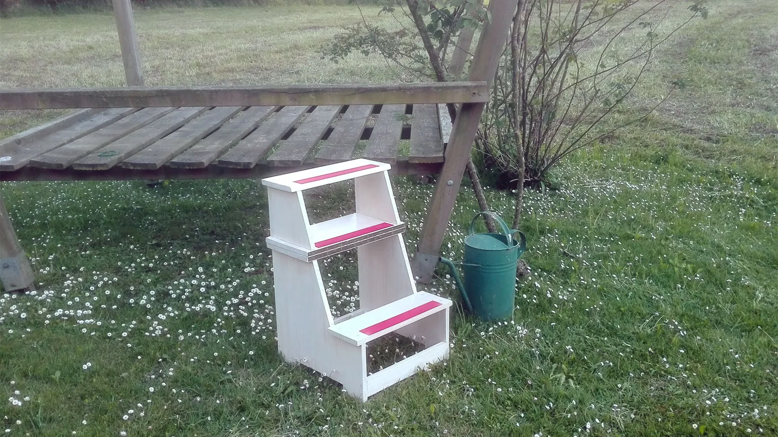 Te proponemos un asiento de madera que en cualquier momento se puede transformar en una escalera firme. Un mueble que nos vendrá fenomenal tanto dentro como fuera de casa para llegar a zonas un poco altas e inaccesibles.