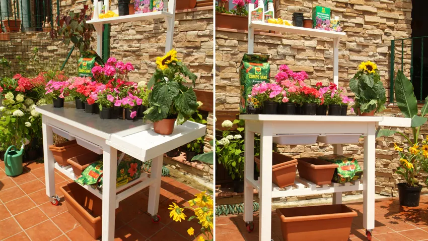 De esta manera tan sencilla, habremos transformado una mesa de trabajo en una práctica mesa de jardinería que nos permitirá realizar trabajos en el exterior con total comodidad, gracias a su altura y superficie útil.