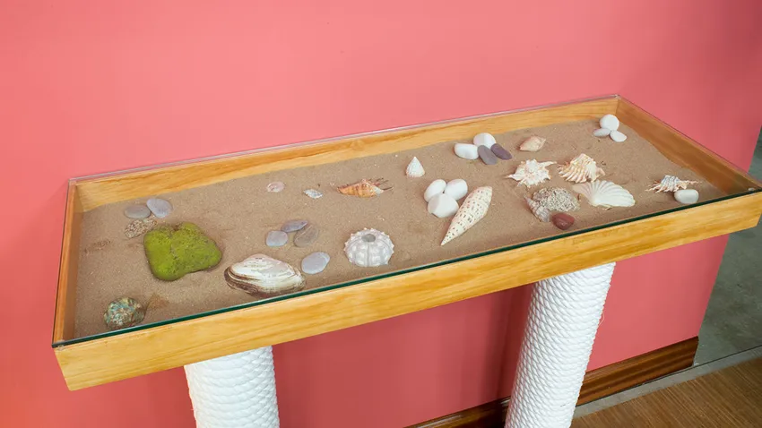 Para terminar, rellenamos la bandeja con elementos náuticos y colocamos la encimera de cristal. Nosotros hemos colocado arena y unas conchitas, pero vosotros podréis decorar esta mesa de recibidor de la manera que más os guste. Y así, tendremos terminada nuestra mesa náutica.