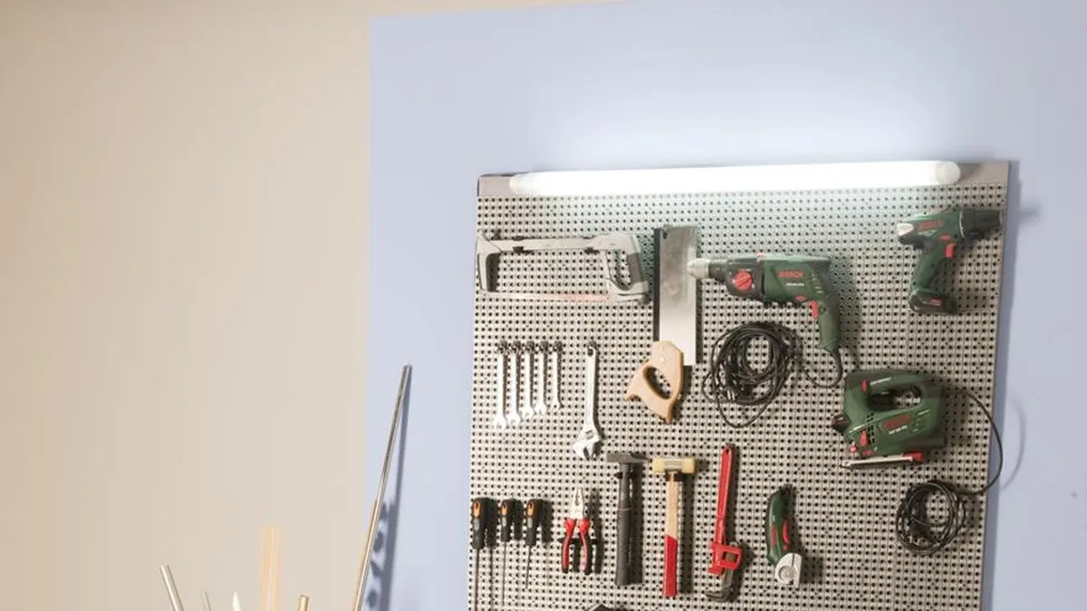 De esta manera tan sencilla, hemos conseguido crear un panel de organización de herramientas y, además, gracias a la lámpara que le hemos incorporado, dispondremos de una zona de trabajo correctamente iluminada.