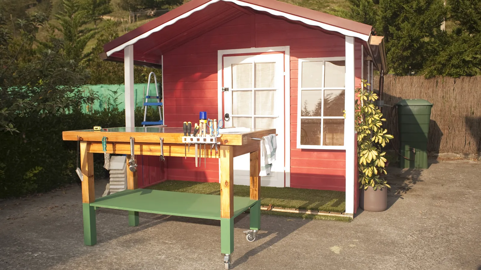 Vamos a mantener la estructura de la vieja mesa, pero cambiaremos la encimera, que está muy deteriorada. La sustituiremos por otra compuesta por un tablero de aglomerado hidrófugo y una chapa galvanizada. Para poder manejarla con más facilidad, fijaremos unas ruedas en las patas de la mesa. Con el objetivo de almacenar nuestras herramientas y materiales, pondremos una balda en la parte baja de la mesa y fijaremos unos soportes y colgadores.