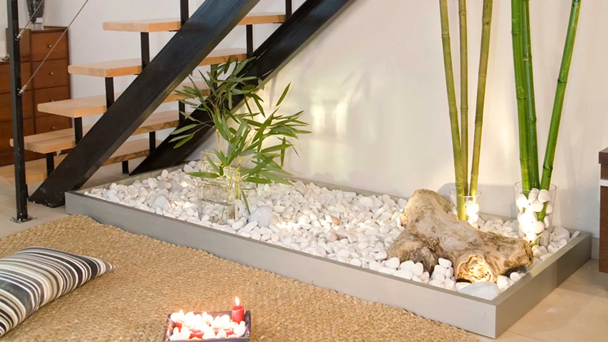 Inspirándonos en esta filosofía, os proponemos aprovechar el hueco que queda libre bajo una escalera interior, creando un rincón interior zen. Un rincón de relajación, con diferentes elementos relativos a la naturaleza.