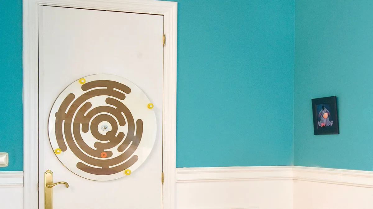 Colocamos unas escarpias en la puerta o en una de las paredes del dormitorio, por ejemplo, y colgamos la ruleta laberinto. Si no queréis taladrar la superficie, podéis fijarla empleando cinta adhesiva de doble cara. De esta manera tan sencilla, tendremos el trabajo totalmente terminado. Original esta ruleta laberinto ¿verdad?