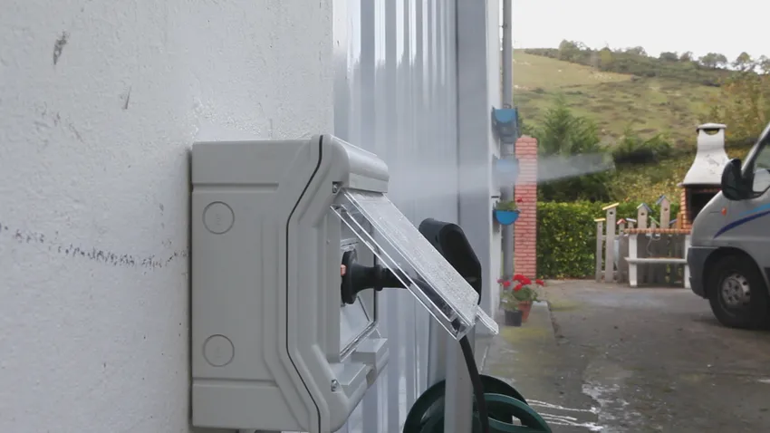 La caja que nosotros hemos instalado, además de contar con dos bases de enchufe y un magnetotérmico, es estanca y tiene tapa, por lo que está perfectamente protegida de las inclemencias del tiempo.
