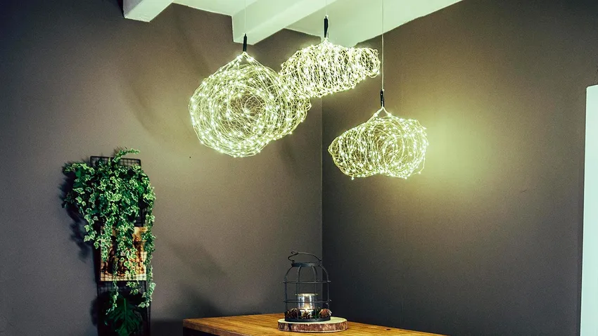Con una rejilla de gallinero vamos a hacer unas originales lámparas con forma de nube. Las vamos a colocar colgadas en el techo a diferentes alturas creando un ambiente mágico y diferente.