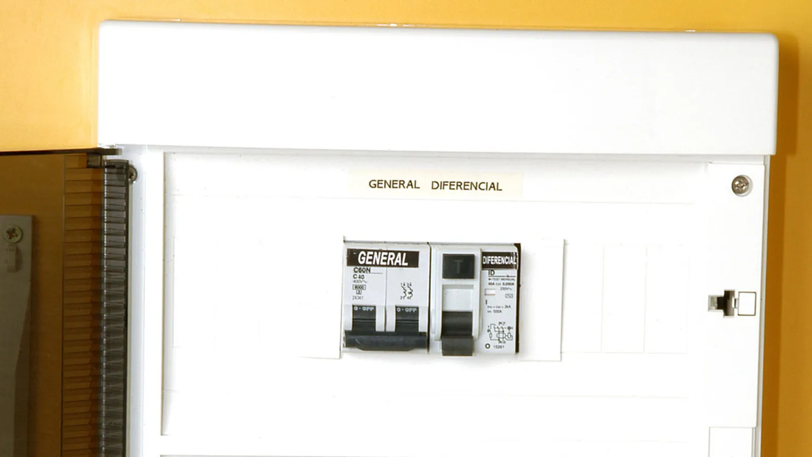 La función del térmico general es cortar o dar paso a la corriente eléctrica de toda la casa. El interruptor diferencial, por su parte, saltará cuando haya una fuga a tierra. Esta pieza lleva un interruptor que utilizaremos para comprobar que la instalación funciona correctamente.