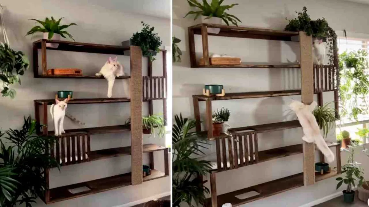 La instagramer @through.the.leaves está arrasando con el proyecto DIY que ha creado para sus gatos, Kusa y Gouda. Se trata de un mueble hecho con baldas y listones de madera, muy decorativo y perfecto para tu mascota.