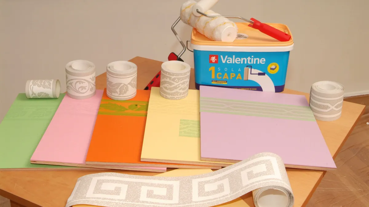 A continuación, aplicamos en la cenefa con un rodillo de espuma una pintura plástica de una sola capa, para interior, de alta cubrición y con un acabado mate. Con el mismo producto cubriremos tanto la cenefa que hemos colocado como la pared, en cuyo caso emplearemos un rodillo de pelo.
