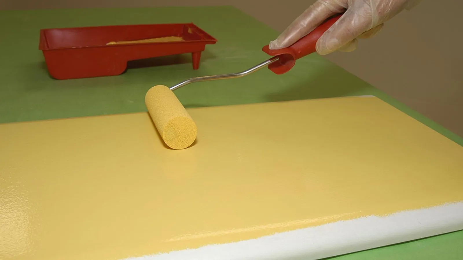 Con un rodillo especial para lacar, damos dos manos de esmalte adecuado para este tipo de trabajos, en nuestro caso en color amarillo.