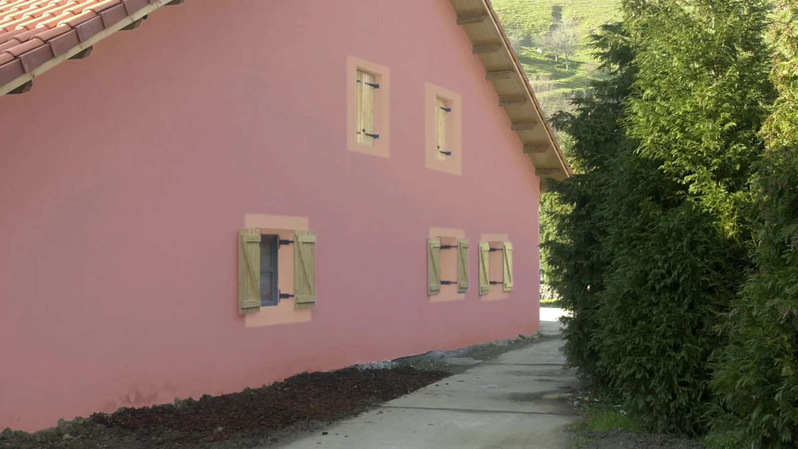 Después, pintamos la mocheta de la ventana y un marco decorativo alrededor de la misma con un tono diferente al del resto de la fachada.