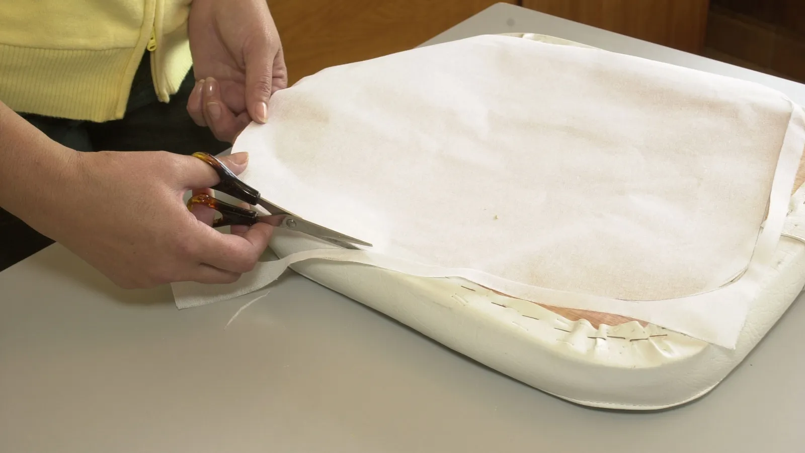 Presentamos la base en la pieza de polipiel y la sujetamos, de forma provisional, con unas tachuelas que clavaremos con un martillo de tapicero. A medida que vayamos grapando, retiramos las tachuelas.