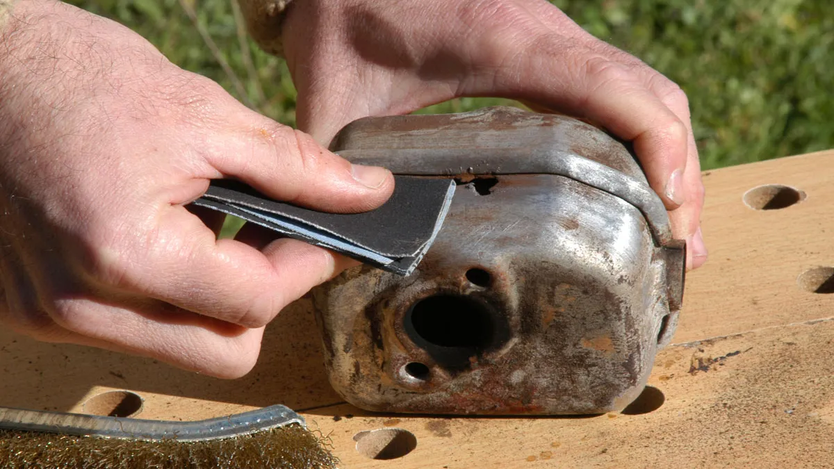 Arreglaremos el agujero utilizando una soldadura reparadora en frío. Comenzamos el trabajo lijando la zona para retirar los restos de óxido con un cepillo de alambre y con una lija de mano para metal.