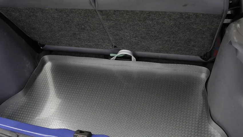 Terminamos el trabajo colocando en la bandeja un trozo de cincha con unas grapas, a modo de tirador. De esta forma podremos retirar la bandeja del maletero con mayor facilidad.
