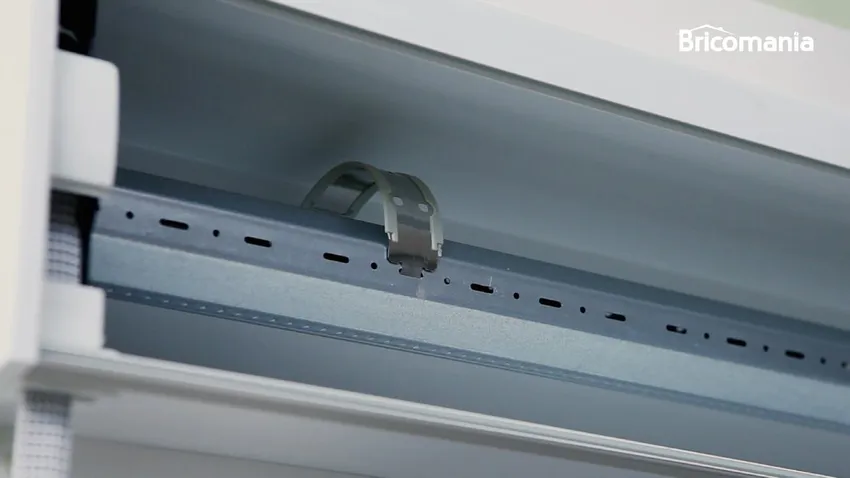 Después, baja la persiana completamente y libera el eje de los anclajes soltando el tirante que está roto.