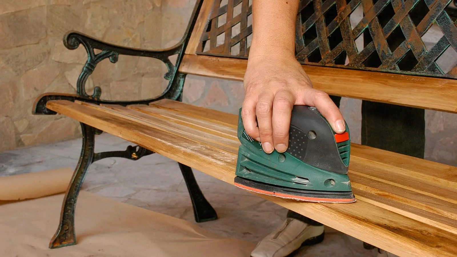 Para recuperarlo totalmente, lo primero que haremos es lijar toda la superficie, la forma delta de la lijadora nos permitirá llegar a las zonas de difícil acceso. Con la misma hoja de lija repasaremos la madera y el metal.