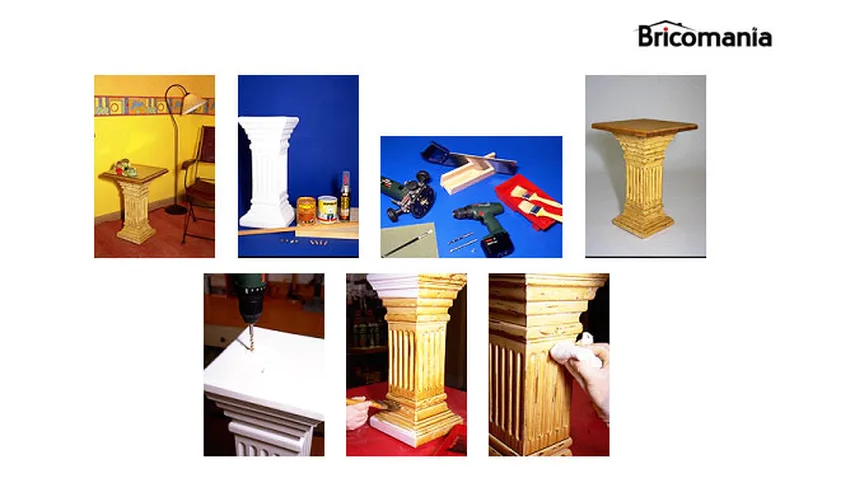 Con una sencilla peana de escayola, un tablero de madera, barniz y mucha ganas podemos convertir una columna en una mesita auxiliar, un mueble muy versátil que nos servirá para dejar cosas y a la vez decorar cualquier rincón.