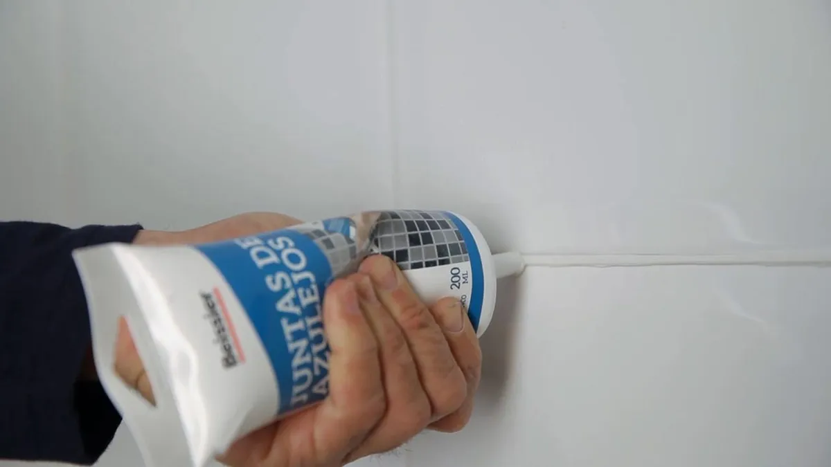 Aplicamos directamente la masilla para juntas de azulejos con la cánula por todas las juntas deterioradas.