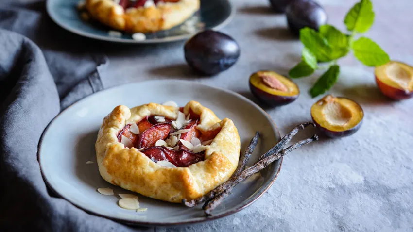 Receta de tarta de ciruelas de Eva Arguiñano. Un postre a base de pasta brisa rellena de ciruelas y una crema de almendras.
