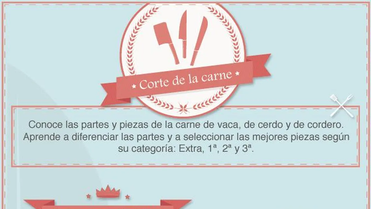 Aprende con esta infografía las partes y piezas de la carne de vaca, de cerdo y de cordero. Conoce cómo diferenciar las partes y a seleccionar las mejores piezas según su categoría: Extra, 1ª, 2ª y 3ª.